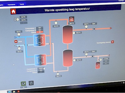 We schuiven aan bij Jeroen van Abswoude en David Muntjewerff. Jeroen is de man van Saskia en is sinds september 2021 verantwoordelijk voor de technische dienst bij het resort en David is een van de eigenaren van de appartementen en is sinds 2019 voorzitter van het bestuur van de VVE. Sindskort draaien alle 55 appartementen op twee hybride warmtepompen, die aardwarmte halen uit in totaal 160 boringen. Jeroen: “Het bleek dat deze warmtepompen al heel wat jaren stil stonden omdat een stukje software het niet goed deed.” David knikt en vult aan: “De reparatiekosten liepen toentertijd helemaal uit de hand waardoor werd besloten weer over te gaan op gas. En dat kon in die tijd ook, de gas- en energiekosten waren toen niet hoog.”